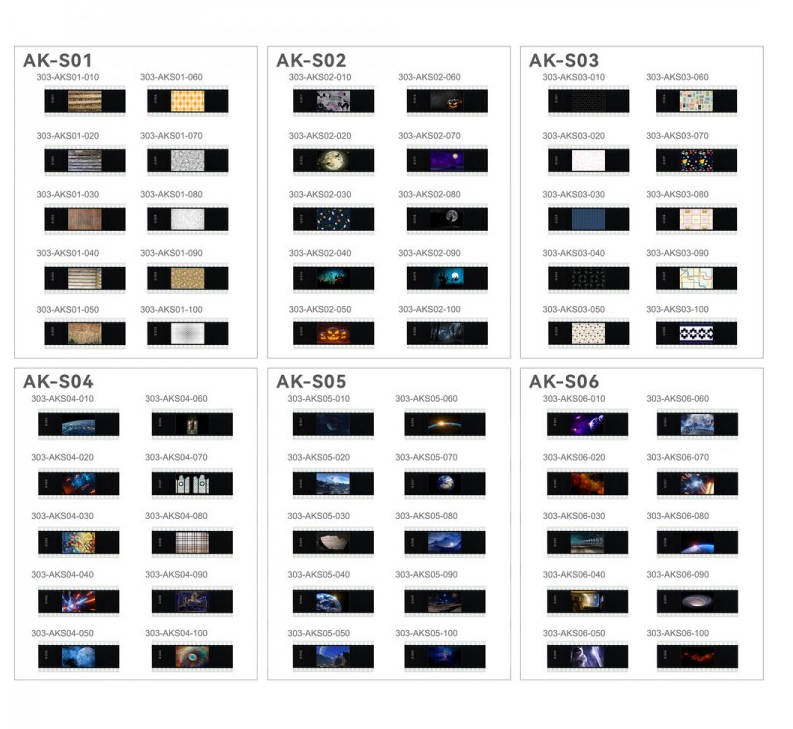 El conjunto completo de AK-S incluye 6 juegos de diapositivas, desde AK-S01 hasta AK-S06, en los que encontramos 10 de cada uno, lo que nos da un total de 60 diapositivas únicas para usar con el accesorio de proyección AK-R21 (disponible por separado). El conjunto completo nos brinda la más amplia gama de posibilidades para combinar el efecto con una escena.