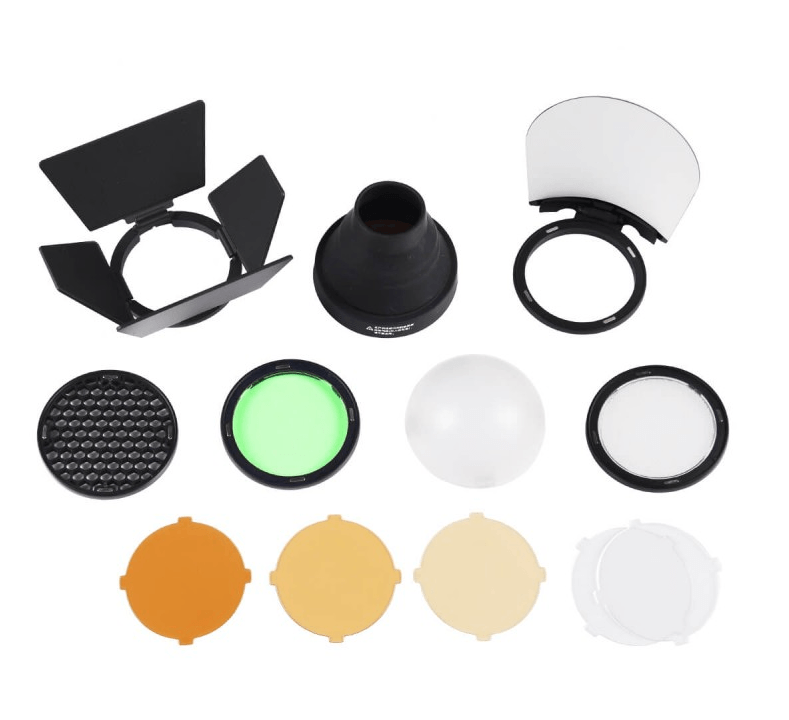 Un conjunto de accesorios absolutamente necesarios en el trabajo profesional con iluminación fotográfica para las series de lámparas Godox AD100Pro, AD200 / AD200Pro y Godox V1. Incluye: Aletas, panal de abeja, filtros de color, Snoot, bola difusora, difusor reflector, reflector de difusión/puerto para accesorios magnético