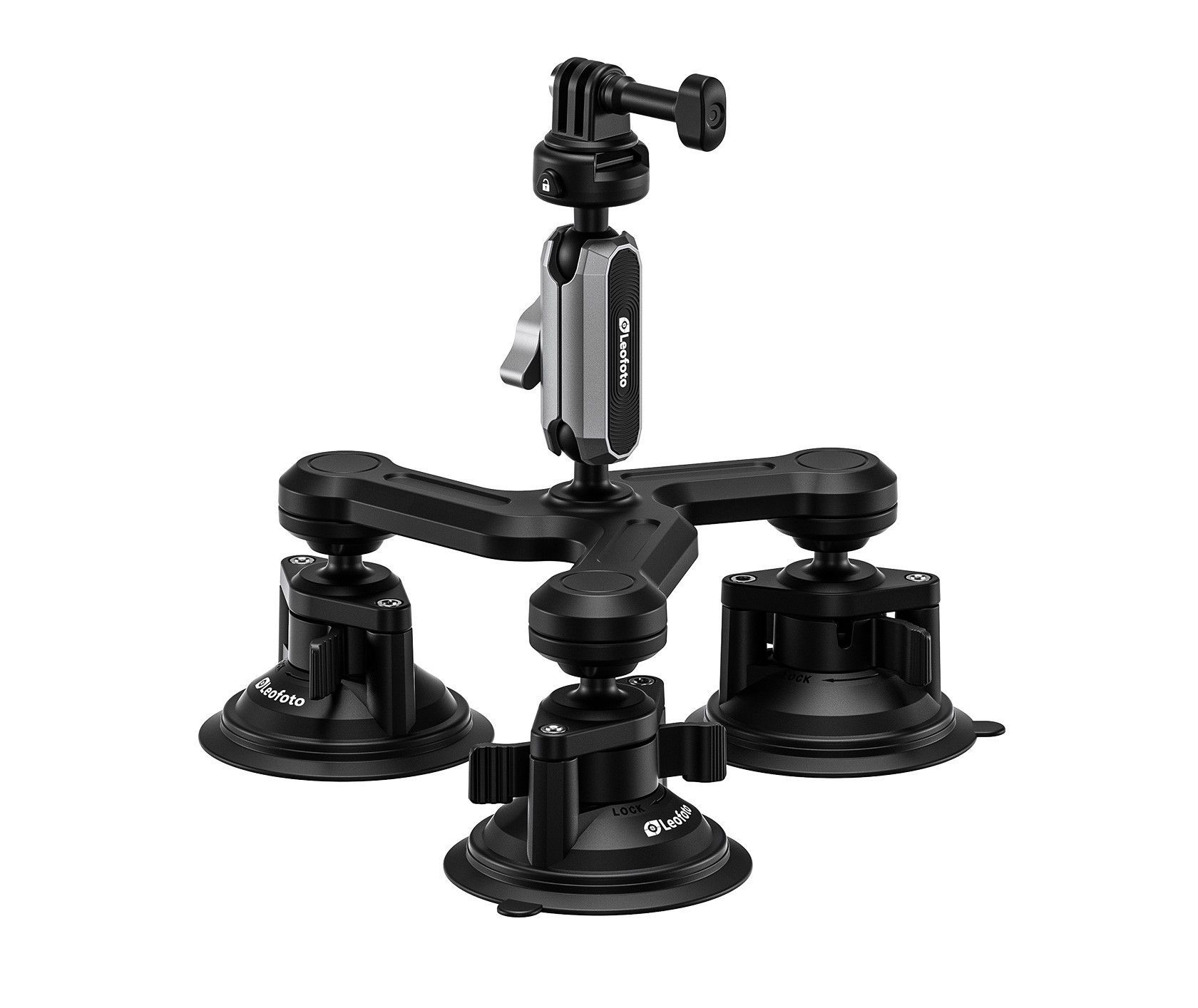 Soporte con tres fuertes ventosas para cámaras de acción, fabricado en aluminio CNC, que combina una base de subcción potente con una rótula esférica de 20 mm para un ajuste flexible del ángulo de grabación; cuenta con rosca estándar 1/4″ compatible con cámaras y sistemas GoPro, soportando cargas ligeras en aplicaciones estáticas o con baja vibración.