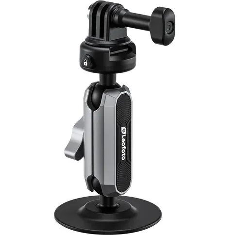 Soporte de ventosa (suction cup) diseñado para cámaras de acción, fabricado en aluminio CNC, que permite una sujeción rápida y segura en superficies lisas (como vidrios o carrocerías); incorpora una rótula esférica de 20 mm para ajustar el ángulo, monta cámaras con rosca estándar 1/4″ o adaptadores GoPro, y está pensado para escenarios estáticos con cargas ligeras.