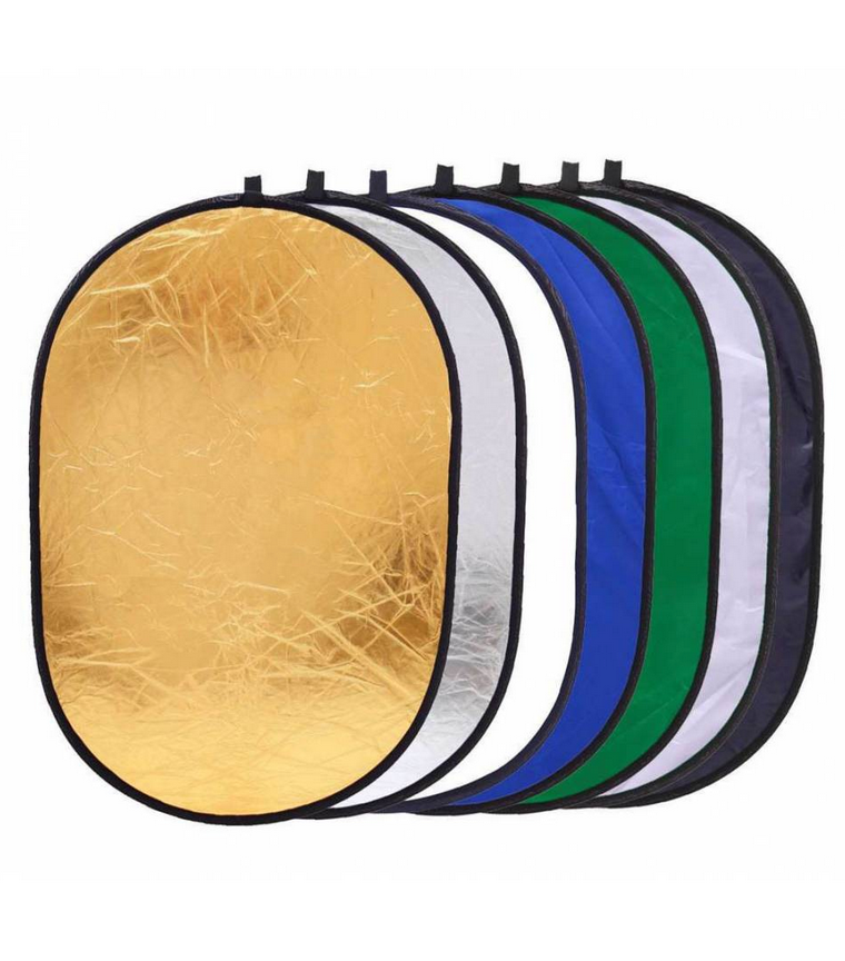 Reflector de 100×150 cm plegable Godox 7 en 1. Se usa para rellenar sombras a fotos rostros y retratos de medio cuerpo. Diámetro abierto de 100 x 150 cm. Dispone de 7 colores: Negro, blanco, dorado, plateado, verde y azul. El centro blanco traslúcido difusor.