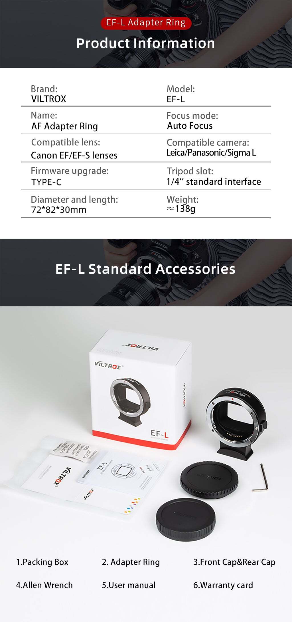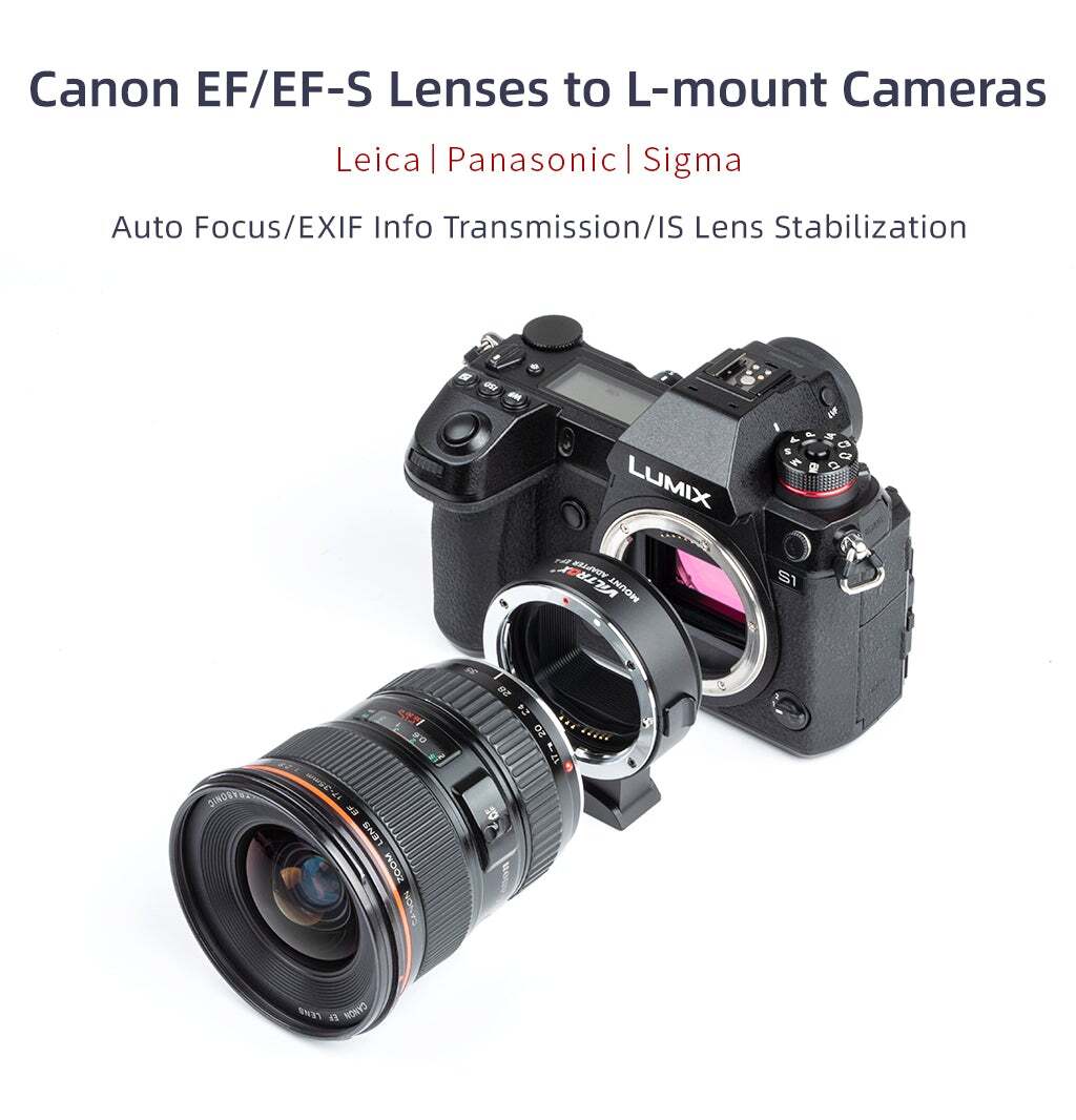 El adaptador de montura de lente Viltrox EF-L es un adaptador de enfoque automático que permite usar objetivos EF/EF-S en modelos de cámara mirrorless con montura L: Leica, Panasonic, Lumix, Sigma L.