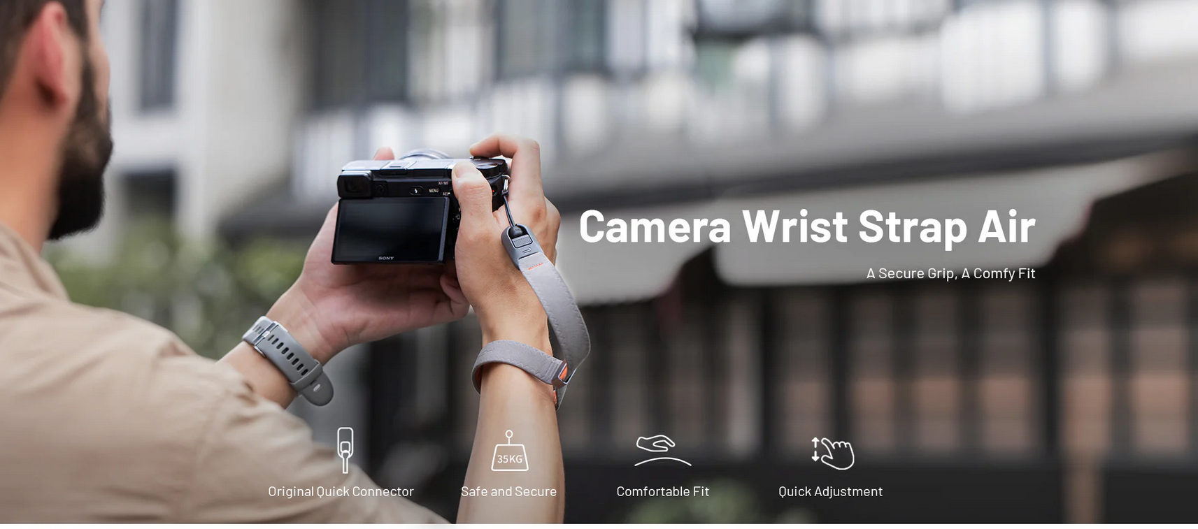 La Camera Wrist Strap Air tiene una longitud ajustable de 20 cm a 33 cm y un ancho de 2.5 cm. Es compatible con cámaras DSLR y mirrorless, proporcionando un agarre seguro y cómodo para la fotografía rápida o al aire libre.