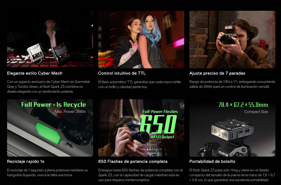 Con un control inteligente de 7 niveles, el flash Spark Z3 cubre un rango de potencia de 1/64 a 1/1, junto con una potente salida de 26W que ofrece tanto un funcionamiento amigable para principiantes como una versatilidad de nivel profesional.