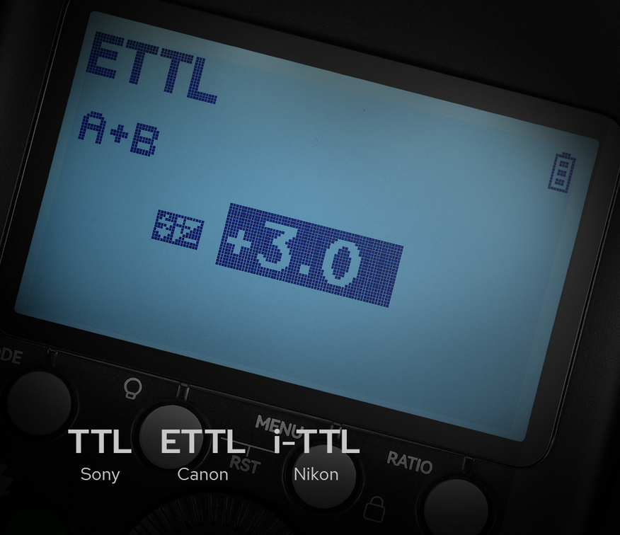 Al ajustar la potencia de 1/1 a 1/128 en pasos de 1/3 de punto, puede lograr la proporción ideal de luz para iluminar uniformemente al sujeto cuando toma fotografías.