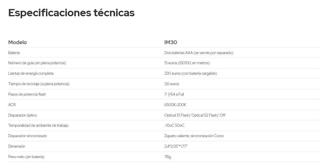 Con un número de guía de 15 (ISO 100, metros), el iM30 proporciona una luz de relleno más brillante y natural que la mayoría de los flashes integrados en cámaras, mejorando la calidad de tus fotos.