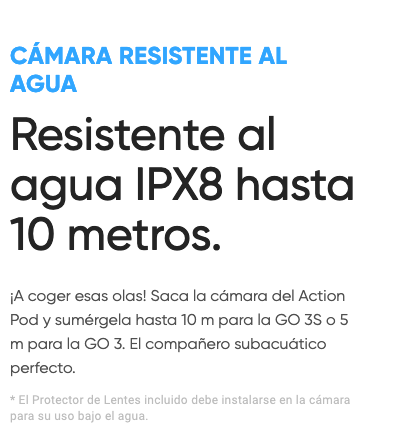 *El Action Pod es resistente a salpicaduras IPX4 sólo cuando la cámara está instalada en él. Está protegido contra la lluvia ligera y la nieve, pero no debe sumergirse en agua ni usarse para actividades que involucren agua a alta velocidad, como surf o esquí acuático.