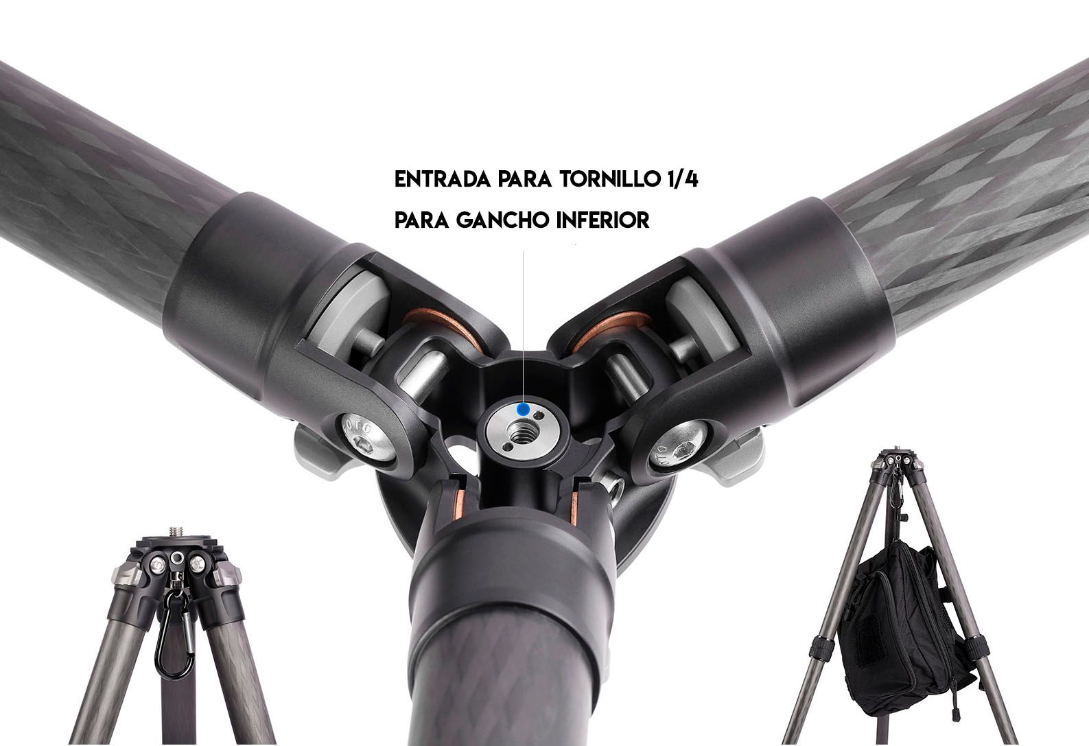 Entrada de tornillo lateral en el cuerpo del trípode para colocar accesorios como brazos articulados, monitores y similares.