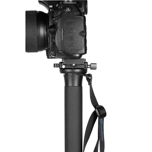 Un soporte metálico con correa de la muñeca asegura que no se puede soltar accidentalmente este monopie de Leofoto.