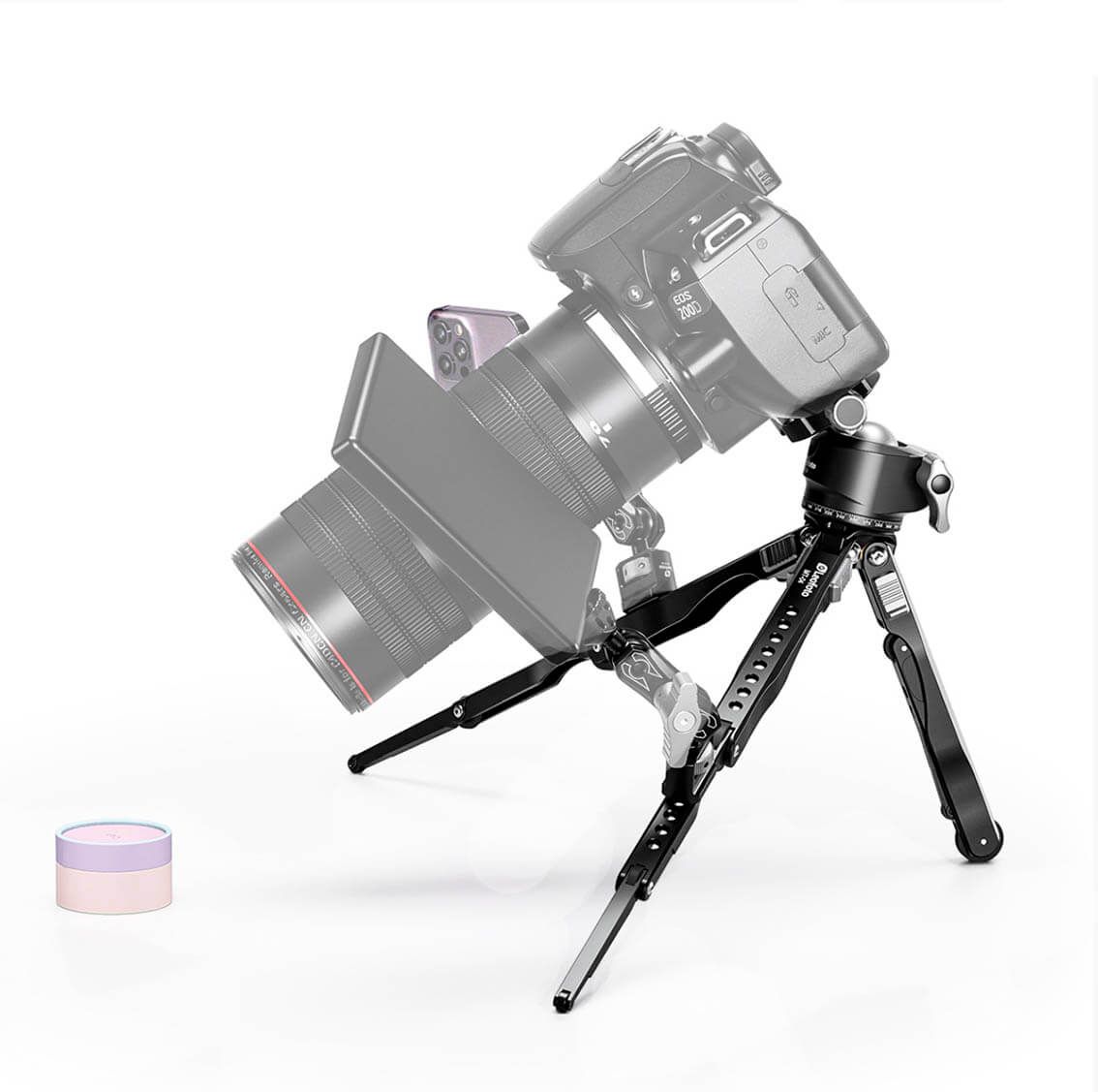 Si necesitas colocarle accesorios como focos led, monitores, cámaras podrás hacerlo. Enrosca cualquier brazo articulado con tornillo 1/4 en cualquiera de las 5 entradas en cada pata que dispone este mini trípode.