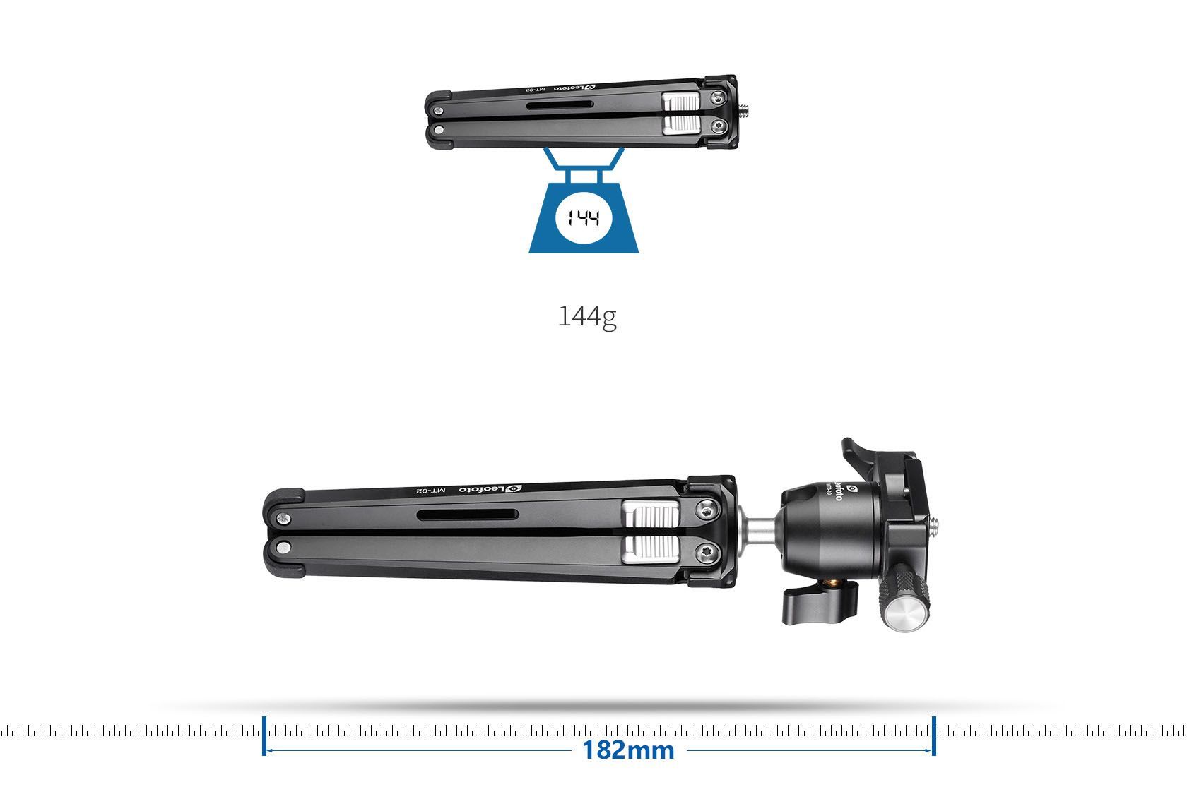 Especificaciones de mini trípode Leofoto MT-02 con rótula de bola MTB-19: