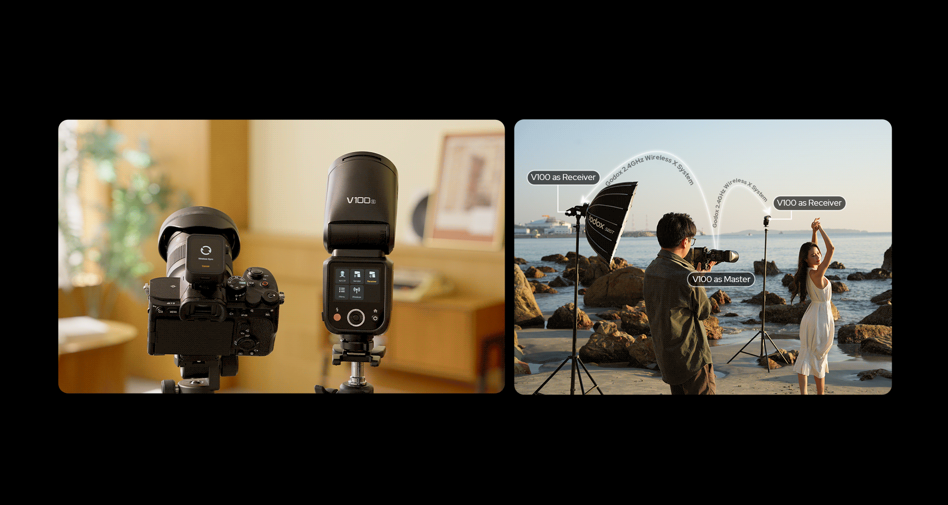 Con el sistema inalámbrico X Godox 2.4G incorporado, el V100 funciona como unidad maestra y receptora. Su capacidad de emparejamiento con un solo toque se integra perfectamente con el disparador X3 u otras unidades de flash inalámbrico Godox, agilizando las configuraciones de múltiples flashes y aumentando la productividad.