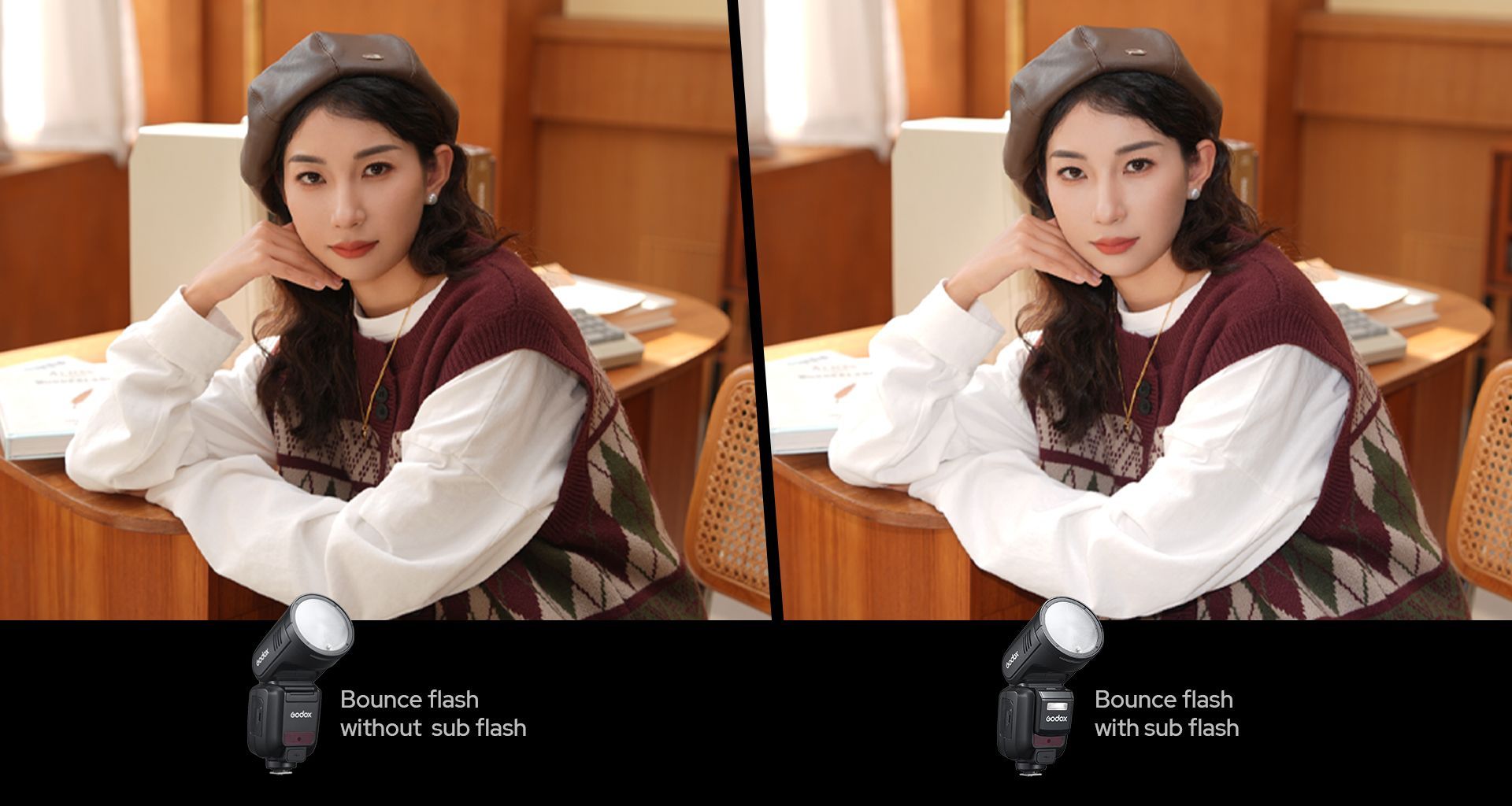 El V100 continúa el muy elogiado diseño de flash secundario desmontable (SU-1) del V1 Pro. Esta característica versátil permite configuraciones de doble luz con un solo flash, ofreciendo soluciones de iluminación creativas para fotografía de retratos.