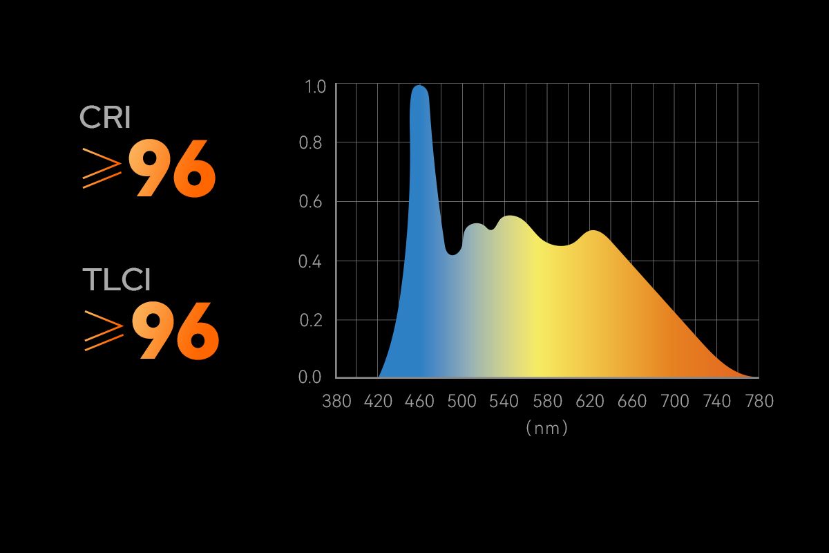 Un índice CRI y TLCI de ≥96 garantiza una reproducción de color realista, y una temperatura de color variable de 2800-6500 K mejora aún más