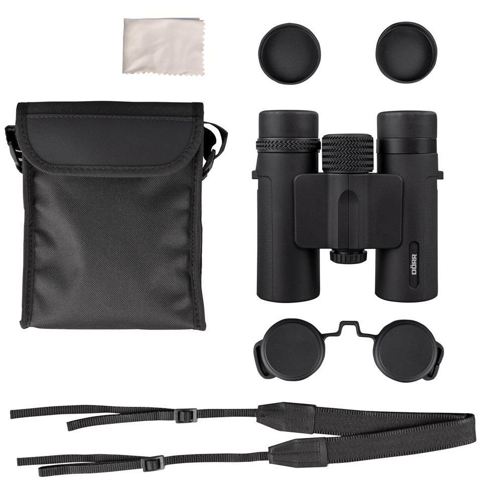 Además de los accesorios obligatorios, como las tapas de los objetivos y los oculares, también se incluyen una correa de transporte, una funda y un paño de limpieza para un uso óptimo.