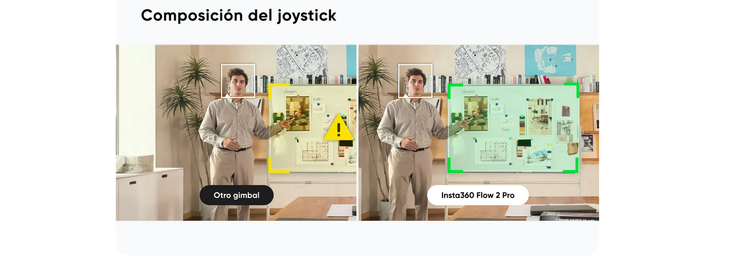- Con el avanzado seguimiento guiado por IA, Flow 2 Pro identifica sujetos de forma precisa en entornos complejos, manteniendo una sujeción firme y nunca perdiendo el seguimeinto del sujeto.