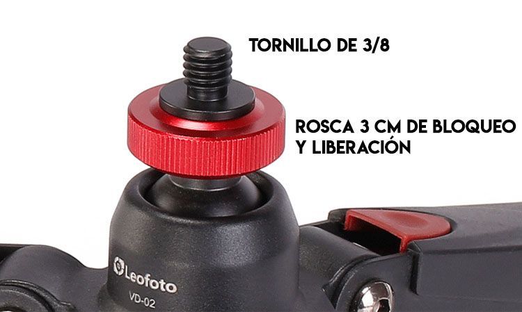 En la parte inferior dispone de un tornillo 3/8 forrado de caucho que hará de control de fricción sobre la rótula de bola superior.