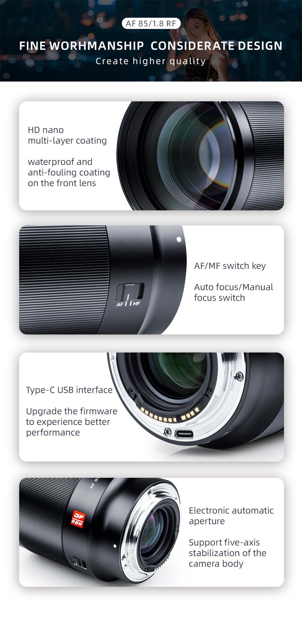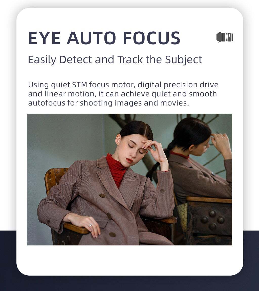 Este modelo soporta el control de autofoco y seguimiento por el ojo Eye AF. Dispone de contactos metálicos en la bayoneta para soportar la transferencia de datos EXIF y el control electrónico del diafragma. Así mismo ofrece autonomía para actualización de firmware accesible gracias a un conector microUSB en la bayoneta del objetivo.