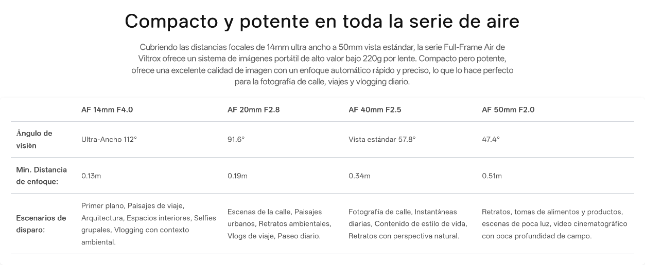 Con su huella compacta -que se desliza fácilmente en un bolsillo de la chaqueta o bolsa de la cámara- se mantiene fiel al diseño ligero y mínimo de la serie Air. Esta lente se convierte en una opción ideal para viajes y fotografía de calle, lo que permite a los creadores capturar impresionantes tomas gran angular.