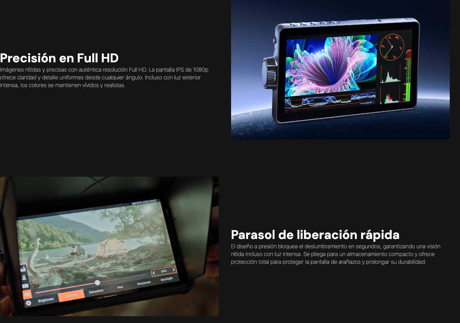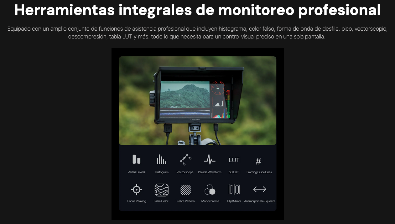 Incluye enfoque máximo, cebras, forma de onda y compatibilidad con LUT. Previsualiza y ajusta el metraje con un control visual preciso.