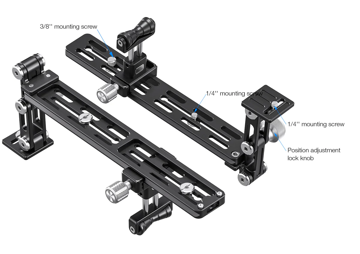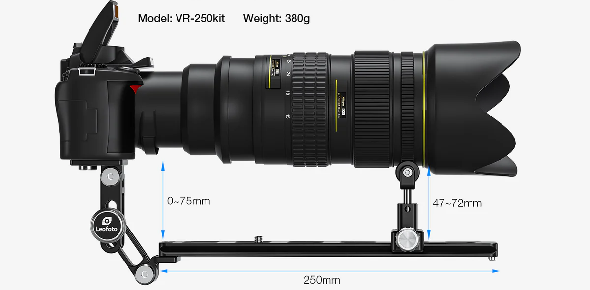 El soporte de lente largo de doble pivote Leofoto VR-250Kit de 250 mm cuenta con un riel de cola de milano estándar Arca y soporte de lente móvil en un lado para brindar a los teleobjetivos grandes un soporte de dos puntos.