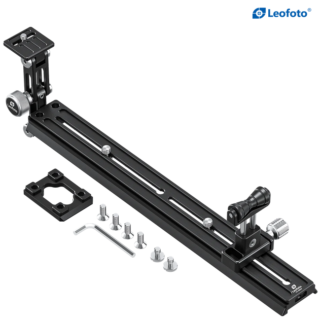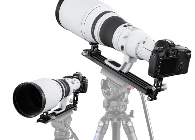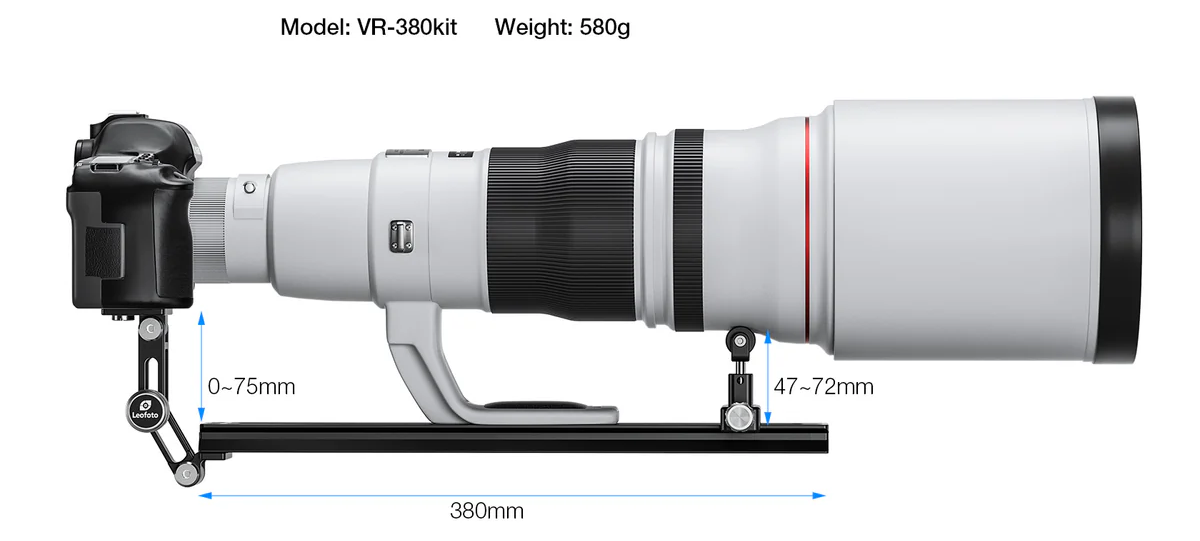 El soporte de lente largo de doble pivote Leofoto VR-380Kit de 380 mm cuenta con un riel de cola de milano estándar Manfrotto/Sachtler para compatibilidad directa con cabezales de trípode Manfrotto/Sachtler y soporte de lente móvil en un lado para brindar a los teleobjetivos grandes un soporte de dos puntos.